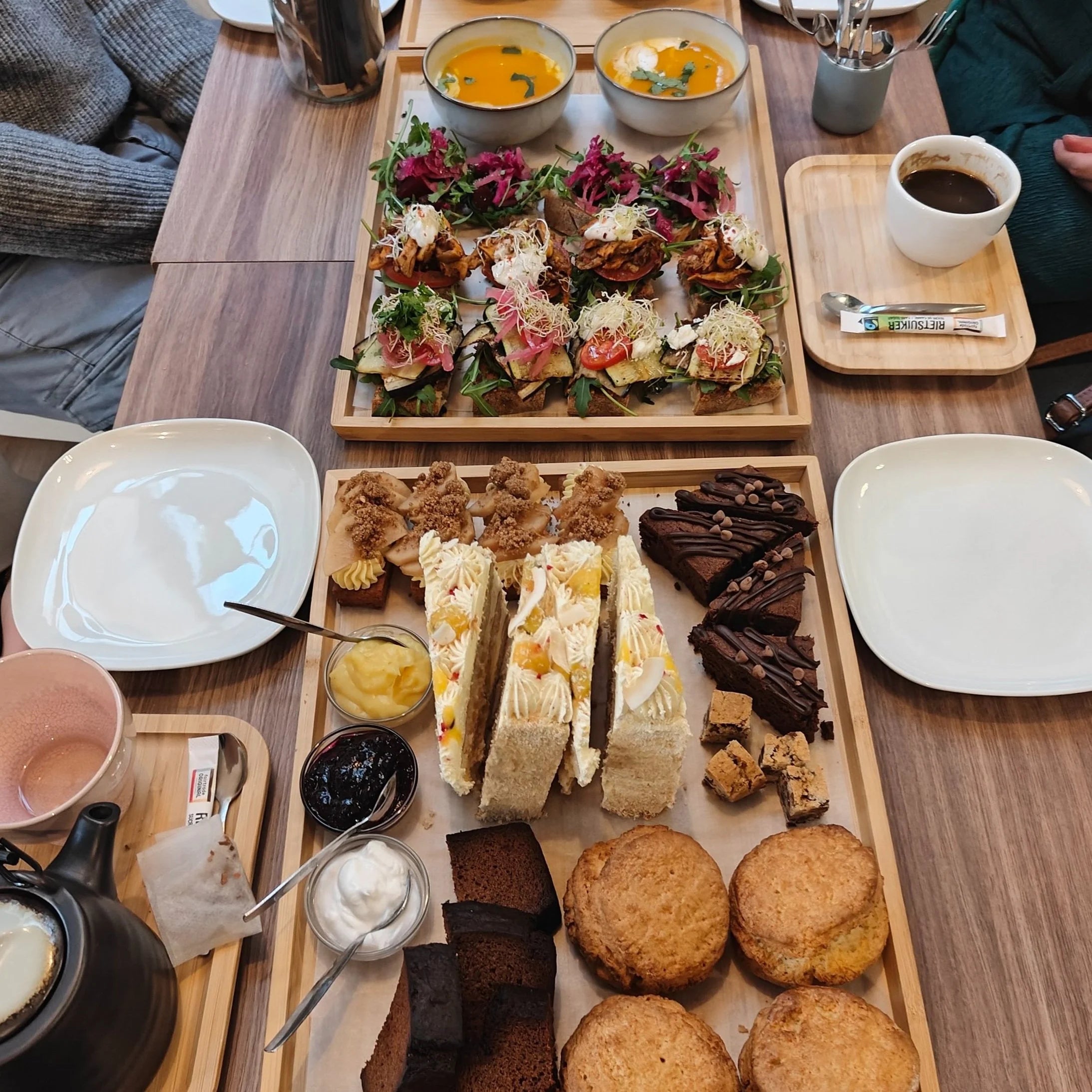 De High Tea kost €28,50 per persoon en bestaat uit verschillende rondes. We beginnen met een soepje en een hartige gang met verschillende broodjes, gevolgd door een zoete ronde met taart, brownie, koek en scones.